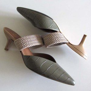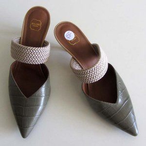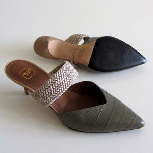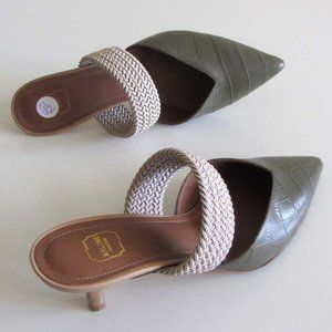 Beautiful MALONE SOULIERS ( Style: Maisie 45 ) slip on mules with crocodile-embossed leather upper, woven stretch strap at mid vamp, pointed toe, padded insole, leather lining/sole and 2" high kitten heel. Hand made in Italy. Size: 36 1/2 ( EU ) Or 6 1/2 ( US ). Color: Army green. Condition: Excellent pre-owned ( worn 1 - 2 times only ). Note: Refinished soles painted in black. No box and dust bags included.