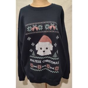 MALTESE CHRISTMAS long sleeve sweatshirt. Size XL. Navy blue w faux crossstitch. Measurements shoulder to hem 28.75". Armpit to armpit 25". Armpit to end of sleeve 21".