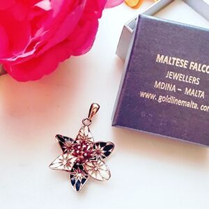 This stunning floral pendant is done in 18k Rose Gold and sterling silver filigree with black and white enamel that is exclusive to the island of Malta. I carried this back by hand and can assure you that you will not find another like it, as this is artisanal work found only in Malta. Measures VERY roughly around 3/4 of an inch in diameter. Box is included. Listing is for pendant only-no chain.