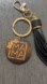 MAMA Round Wood Medallion Black Leather Fringe Gold Tone Modern Keychain