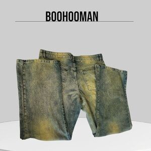BoohooMAN brand jeans, specifically the Relaxed Flared Vintage Tinted Jeans in a vintage wash. The jeans are size 36R and feature a label with the brand name