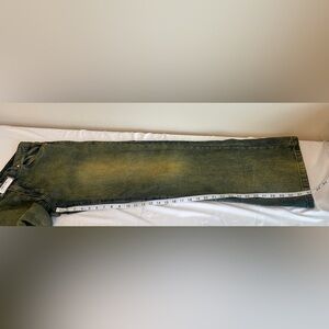The jeans themselves have a textured, vintage-style wash with variations in color.