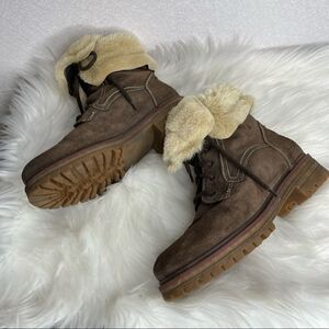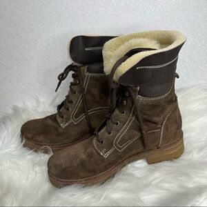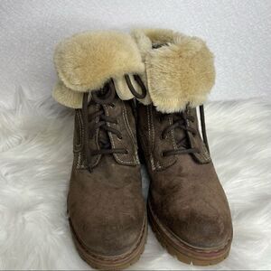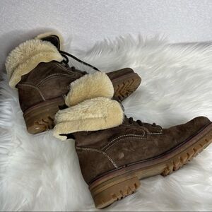 •Features: Brown suede lace up boots. Faux fur cuffs. Fleece lined.