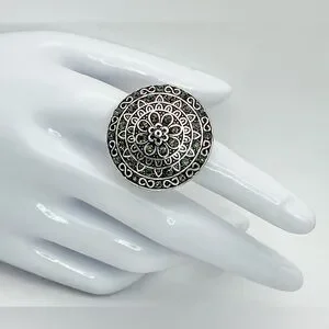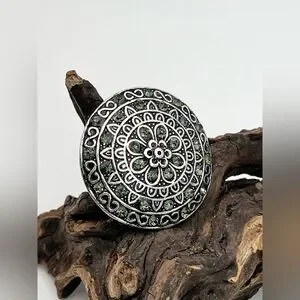 Beautiful silver tone ring with green mandala design. Perfect for adding elegance to any outfit.