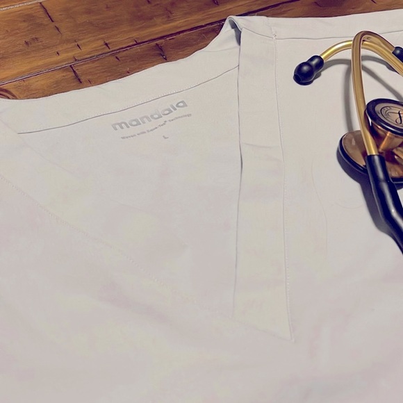 Mandala antimicrobial scrubs for men, silvery gray sky, color, functional practical, nice wonderful fabric with water, repellent features of purchase you won’t regret