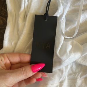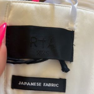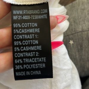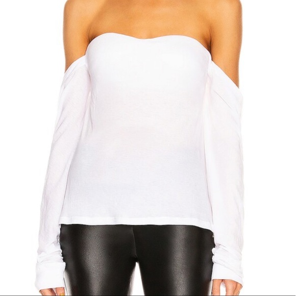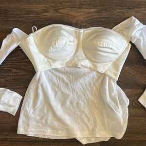 The RtA Mandana Top in white is a top with a bustier underlay with hook and eye back closure and features a soft knit draped long sleeve off shoulder attached overlay