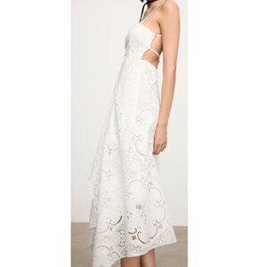 100% cotton fabric. Embroidered fabric. Straight design. Midi design. Square neckline. Sleeveless. Thin straps. Zip fastening on the back section. Inner lining. Asymmetric hem.