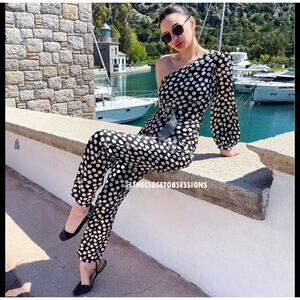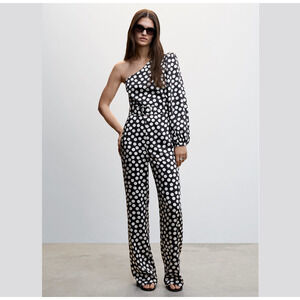 Black/white polka dot long jumpsuit made of flowy satin effect fabric. Asymmetrical neckline with long puffed sleeves. Straight leg. Hidden in-seam side zip closure. Interior lining. Removable printed belt. From MANGO, in US size M, L and XL. New with tags. Sold out in stores.