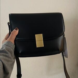 This elegant black leather shoulder bag is perfect for any occasion. Its sleek design and gold accents add a touch of sophistication to your outfit.