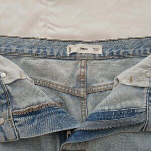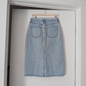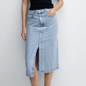 Mango Denim Midi Skirt. Straight design. Zip and one button fastening. Loops. Five pockets. Opening in the lower front. 100% Cotton. Used once. I stitched down the front opening as it was too high for me.