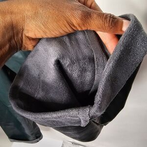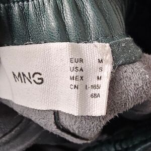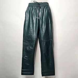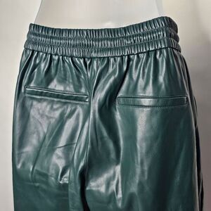 Mango hunter/forest green faux leather jogger pants with two functional front pockets, two faux back pockets, mid to high rise, drawstring waistband, stitching detail, and fleece lined. Tapered straight leg. Hugo Boss dupe.