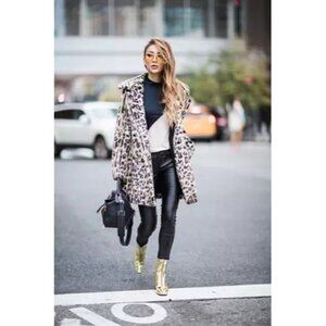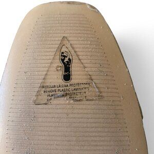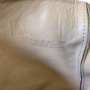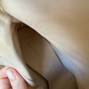Sleek metallic gold leather ankle boots by Mango with a stacked 3" leather coated heel. Side zipper for easy on/off. Leather uppers, insole and outer sole. Size 7. Excellent preowned condition with one or two small light scuffs on the heel. There is a plastic coating on the outer sole which has not been removed, making the outer soles like new.