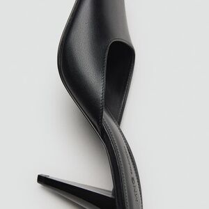 100% goat leather. Backless design. Square-toe. Open toe. Funnel heel. Slip-on. Inner lining. 3.15 in heel.