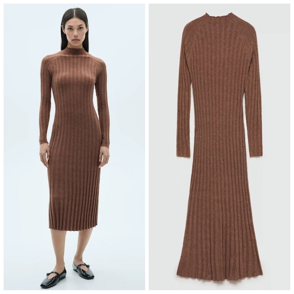 Fine knit fabric. Rib knit fabric. Midi design. Mock neck. Long sleeves. Fitted design.