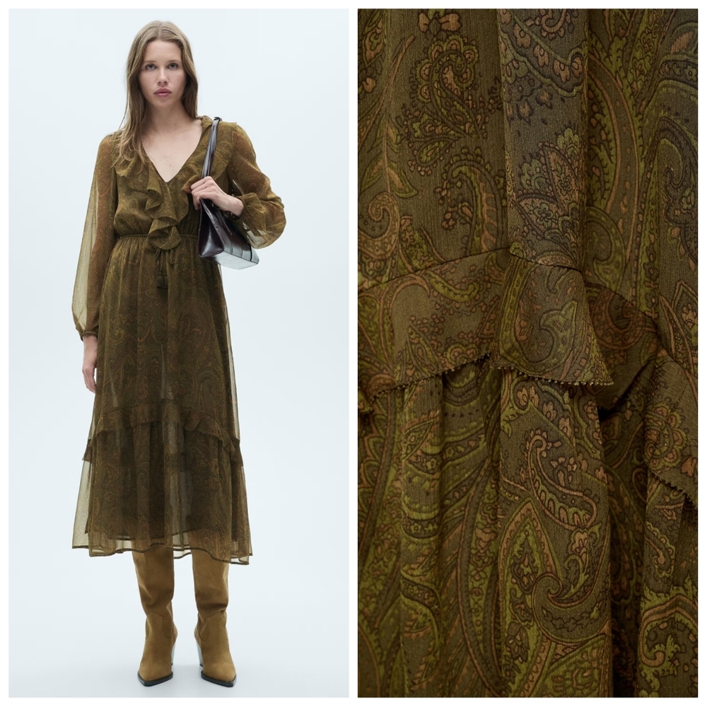Fluid fabric. Long design. A-line design. Semi-transparent design. Paisley print. V-neck. Ruffles detail on the neck. Long sleeves with elastic cuffs. Drawstring waist. Flared hem. Inner lining