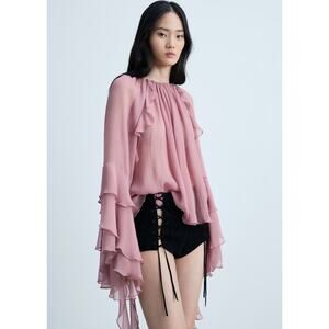 Featuring a crew neck, long flared sleeves, a semi-transparent finish, and ruffle accents with gathered detailing. Straight silhouette. Button closure at back. Lightweight chiffon feel. Material: 100% viscose. Fits true to size