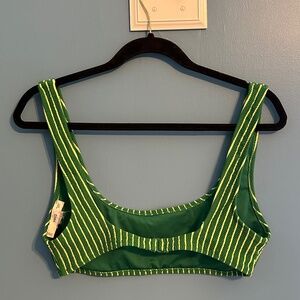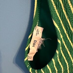Textured fabric. Printed design. Striped print. Wide straps. Hook fastening. Inner lining.