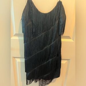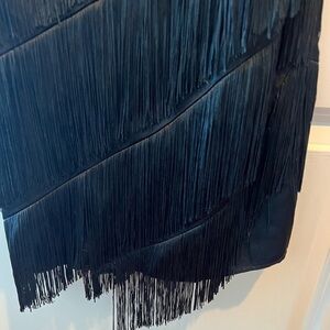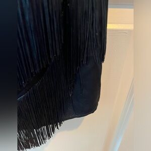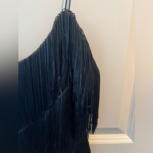 Step out in style with this elegant black fringe dress. Perfect for any occasion, this dress offers a chic and sophisticated look. The fringe detailing adds a playful touch, making it a must-have in your wardrobe.