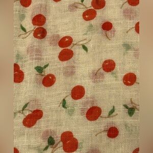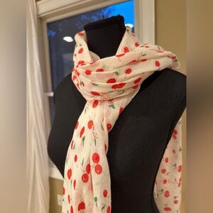 Playful cherry motif on lightweight cotton-linen. Can be worn multiple ways . Generous size 74 1/2 x 35"