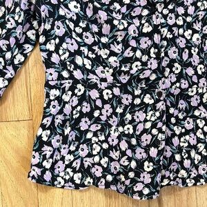 Long sleeve floral top from Mango. Light purple flowers on black background. V-neck, button up closure, flounce hem. Cute feminine top perfect for spring!