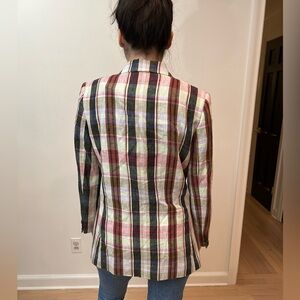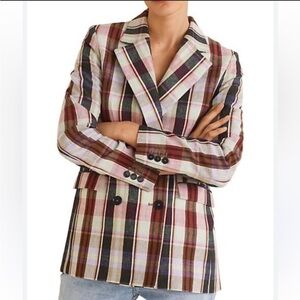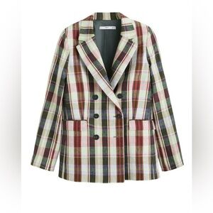 MANGO plaid double breasted linen/cotton blend blazer size S