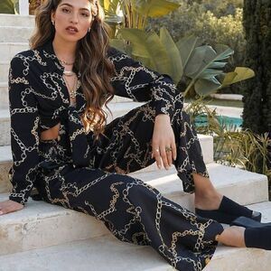 Flowy fabric, Printed design, Straight design, Medium waist, Elastic waist, Side pockets, Committed Collection