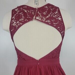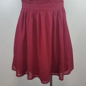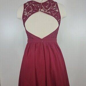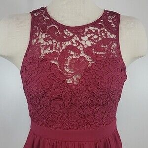 Pre-owned Maniju sleeveless lace overlay open back dress size small. Lace overlay top with open back and flowy skirt. The color is a darker deep red. One of the clasps on back is coming loose. Please see photos.