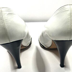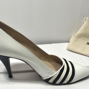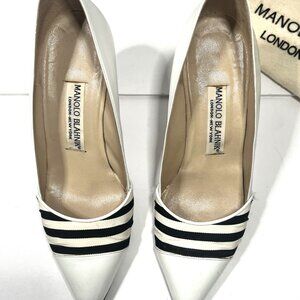 MANOLO BLAHNIK Classic Ivory Leather with Navy Linen Trim US size7 Euro 37-1/2
