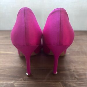 Fuchsia satin almond toe pumps featuring a square crystal buckle encased in a gunmetal frame. Finished with a stiletto high heel.