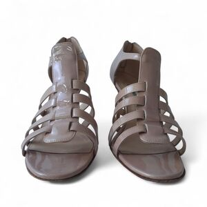 Manolo Blahnik heeled sandals. Hand made in Italy. Size 37.5 EU, fit like a 7 US. Strappy patent leather uppers in nude. Zipper on heel counter. Leather outsole. Uppers have some color transfer and theres a ding on the right heel. Insoles lost some pigment.