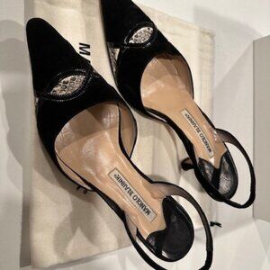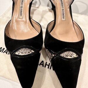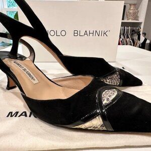 Beautiful kitten heel MANOLO BLAHNIK slingback suede and alligator shoes. Size 38 1/2. 2" heel. Comes with original shoe box and dust cover.