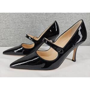 Iconic Manolo Blahnik Campari Mary Jane pumps in glossy black patent leather. Features pointed toe, single strap with button closure, and sleek stiletto heel. Timeless silhouette worn by fashion editors and collectors alike. Size EU 36.5 fits US Women’s 6.5. Made in Italy. MSRP approx. $925 USD.