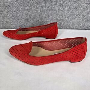 Elegant and breathable Manolo Blahnik flats crafted in rich red suede with perforated mesh detailing. Features a pointed toe silhouette, low stacked heel, and polka-dot interior lining. A rare and refined design that blends comfort with couture craftsmanship.