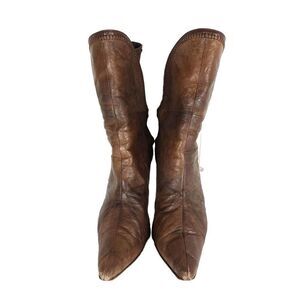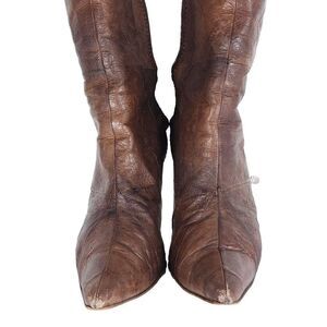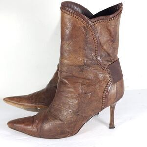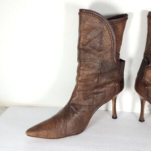 MANOLO BLAHNIK Women's US8,5-9 EU 39,5 Textured Brown Leather Heeled Pointed Toe Ankle Boots .