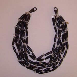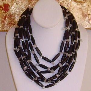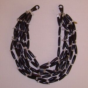 MANOUK Multi-Strand Lucite Necklace is made of lucite tubular beads in black with small hints of brown throughout. Each bead is separated by clear lucite rock-like beads. Measures 16 inches long with a 2 3/4 inch frontal drop. From my own collection purchased on Spain. Excellent condition.