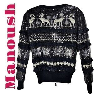 MANOUSH Christmas Cardigan Sweater Jacket Sequin Reindeer Snowflakes Lace, XS