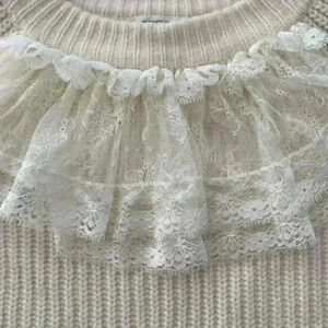 Crew neck, with decorative lace detail.