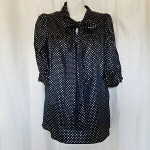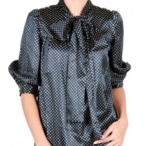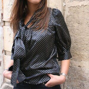 MANOUSH Silk Navy Blue Art Deco Polka Dot Gold Secretary Bow Blouse