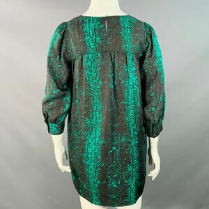 MANOUSH dress in a black and green silk twill featuring an all over snakeskin print, long bishop sleeves, and back button closure.