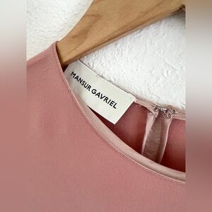 Dusty pink silk short sleeve blouse. A couple faint stains on the bottom front - unseen when worn tucked in. Size 44 = L.