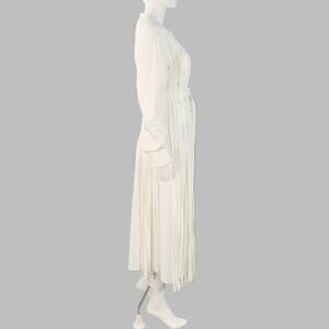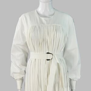 MANTU midi dress in a white cotton woven fabric featuring long sleeves with barrel cuffs, fringe on front and back, and belted closure.