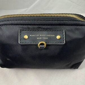 Chic and practical MARC BY MARC JACOBS black nylon cosmetic bag with gold-tone zipper and hardware. Features a structured rectangular shape with leather logo patch on front stamped “MARC BY MARC JACOBS NEW YORK.” Fully lined interior with signature Marc Jacobs logo print and one slip pocket. Compact yet roomy, perfect for carrying makeup, toiletries, or daily essentials.