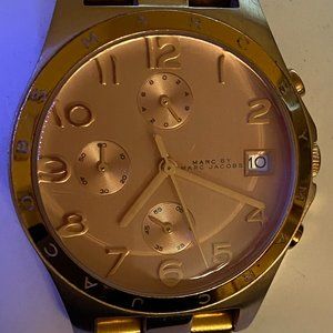 MARC BY MARC JACOBS Henry Chronograph Rose Dial Rose Gold Ion-plated Ladies Watch: Item No. MBM3074. New battery installed, works. Some wear on bracelet. Rose gold ion-plated stainless steel case with a rose gold ion-plated stainless steel bracelet. Fixed rose gold ion-plated bezel. Rose dial with rose gold-tone hands and Arabic numeral hour markers. Chronograph - three sub-dials displaying: 60 second, 60 minute and 1/10th of a second. Quartz movement. Scratch resistant mineral crystal. Pull / push crown. Case size: 36.5 mm. Fold over with safety release clasp. Water resistant at 30 meters / 100 feet. Functions: chronograph, date, hour, minute, second. Fits up to 6 1/2" wrist. There are no extra links.