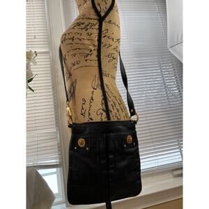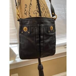 Deep patch pockets with asymmetrical, logo-embossed turnlocks define a cleanly styled bag with a shoulder strap that adjusts for crossbody carrying.