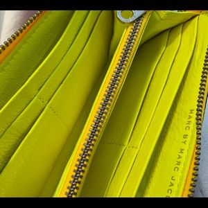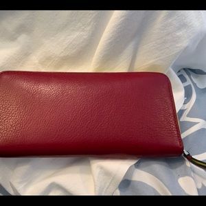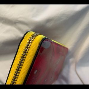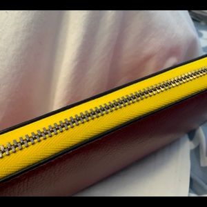 Unique poppy printed in red on one side of wallet and plain burgundy leather on the flip side with a yellow zip in the middle. Yellow inside.size 8x4