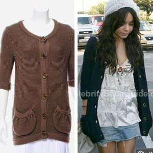 Brown short sleeve chunky wool knit medium-weight cardigan with brass button fastenings on front. Marc by Marc Jacobs cardigan has a round scoop neck, two patch pockets on front, an inverted pleat on back and turn back cuffs.