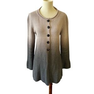 Size 2, button front, acrylic, wool, alpaca blend, matching scarf, gray and beige ombre color scheme.