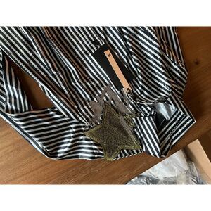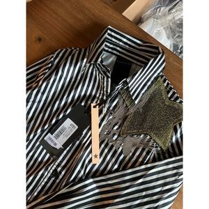 100%Polyester satin, fringes, contrasting applications, stripes, classic neckline, long sleeves, buttoned cuffs, button closing, no pockets, hand wash, dry cleanable, do not bleach, do not tumble dry, iron at 110° c max