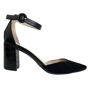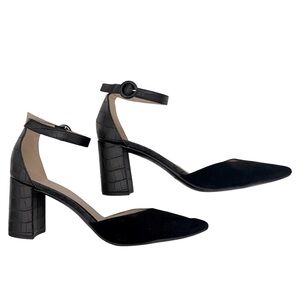 MARC FISHER • Black Crocodile Print Block Ankle Strap Pointed Toe Pump Heel