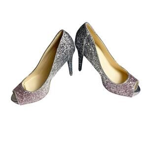 MARC FISHER Harpyly Glam Ombre Glitter Platform Peep Toe Heels Silver Size 8.5